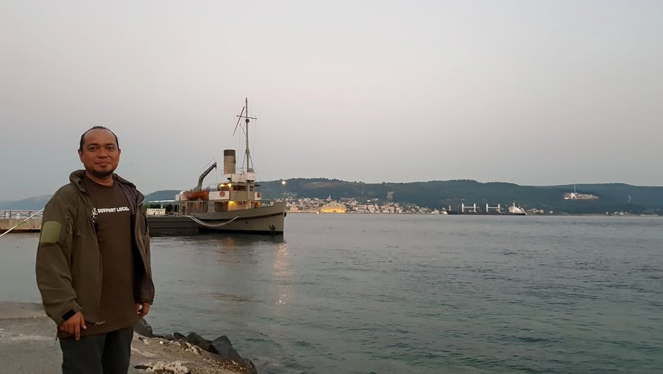 Setelah tawaquf hingga syuruq di Yalı Cami dekat dermaga kota Çanakkale, berfoto bersama replika kapal penebar ranjau Nusret.