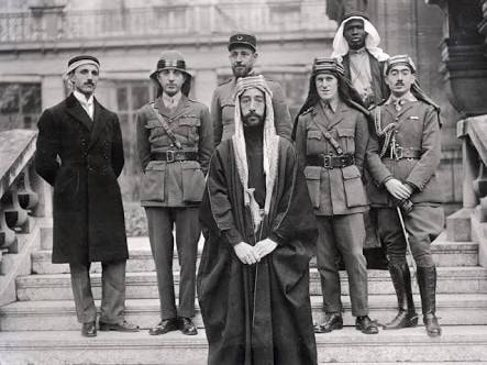 Dari kiri ke kanan: Rustum Haidar, Nuri as-Said, Pangeran Feisal ibn Hussein ibn Ali, Kapten Pisani (Perancis, belakang), Kolonel TE Lawrence (Inggris), Pengawal pribadi Feisal (belakang), Kapten Tahsin Kadry