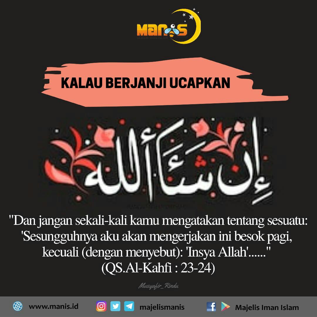 1. Dan jangan sekali-kali kamu mengatakan tentang sesuatu: “Sesungguhnya aku akan mengerjakan ini besok pagi, kecuali (dengan menyebut): “Insya Allah”. Dan ingatlah kepada Tuhanmu jika kamu lupa dan katakanlah: “Mudah-mudahan Tuhanku akan memberiku petunjuk kepada yang lebih dekat kebenarannya dari pada ini”. (Al-Kahfi: 23-24)